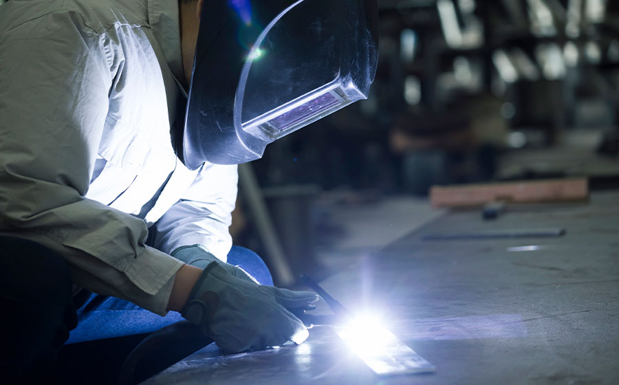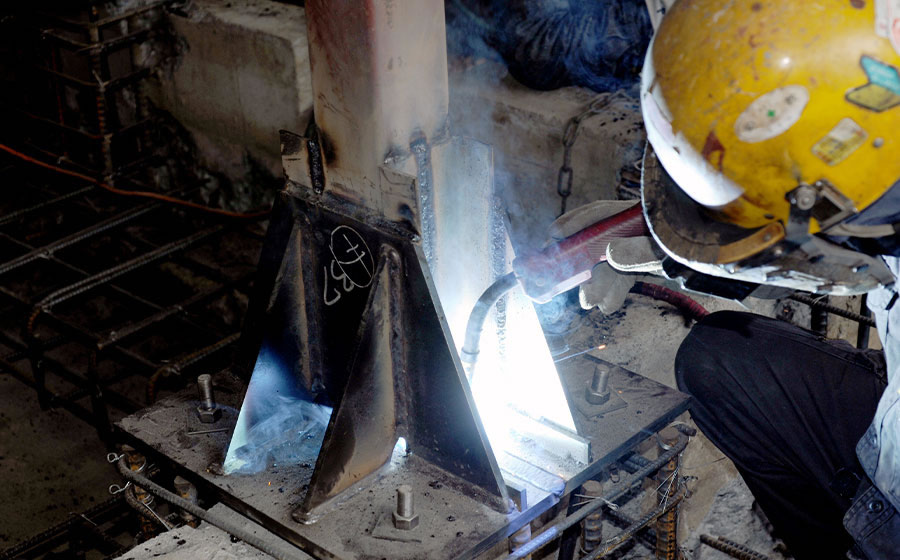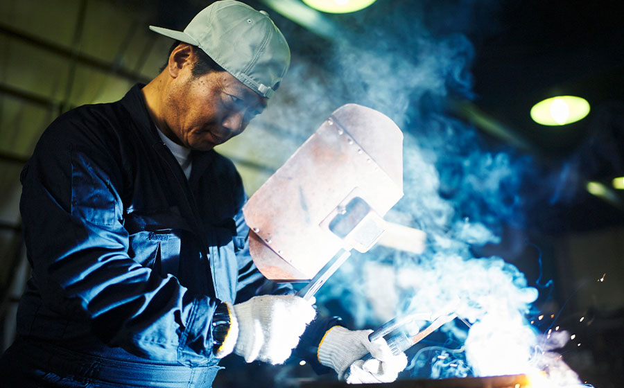 はんだごてと同じ要領で、「トーチ」と呼ばれる加熱器具で鉄を溶かし、それぞれの資材を接合します。弊社では炭酸ガスを使う「CO2溶接」という半自動溶接を採用しています。 -